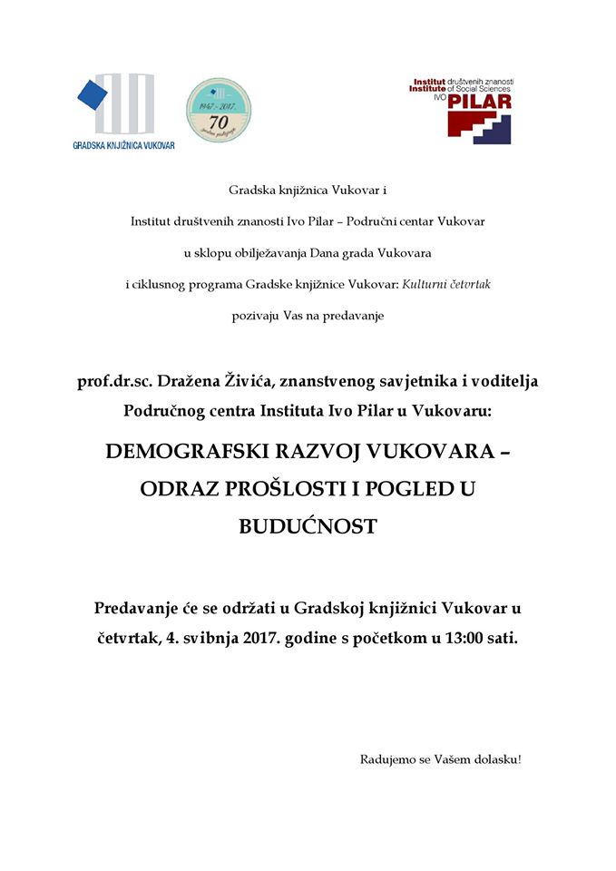 Gradska knjižnica Vukovar i Institut društvenih znanosti Ivo Pilar – Područni centar Vukovar, u sklopu obilježavanja Dana grada Vukovara i ciklusnog programa Gradske knjižnice Vukovar: Kulturni četvrtak, pozivaju Vas na predavanje Demografski razvoj Vukovara – odraz prošlosti i pogled u budućnost u četvrtak, 4. svibnja 2017. godine s početkom u 13:00 sati. Predavanje će održati prof.dr.sc. Dražen Živić, znanstveni savjetnik i voditelj Područnog centra Instituta Ivo Pilar u Vukovaru.
