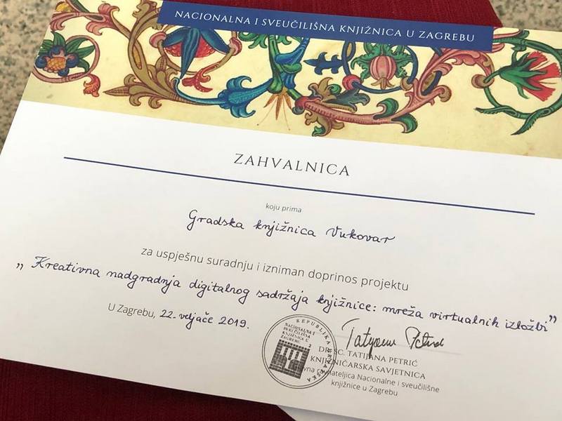 Na svečanosti Gradskoj knjižnici Vukovar uručena je zahvalnica za uspješnu suradnju i izniman doprinos nacionalnom projektu „Kreativna nadogradnja digitalnog sadržaja knjižnice: mreža virtualnih izložbi".