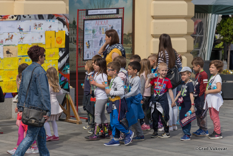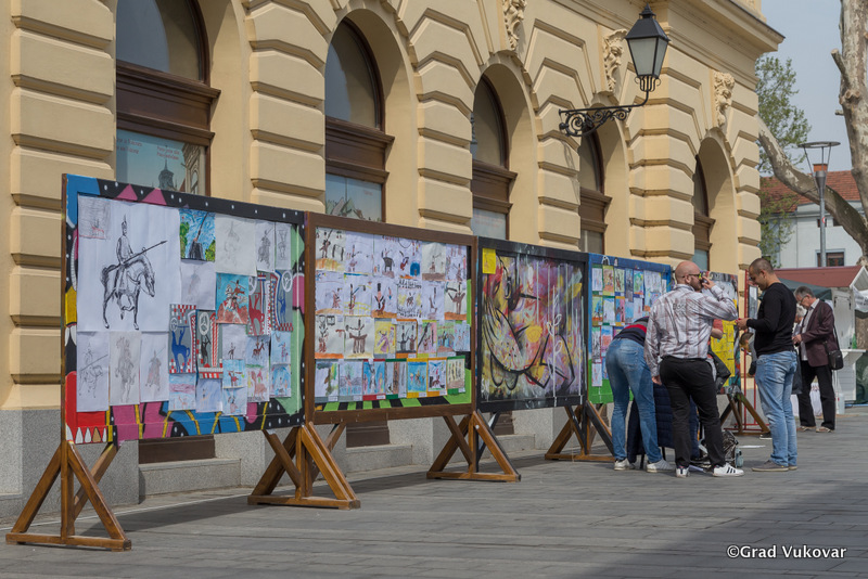 S desne obale Vuke uz Grand hotel postavljena je izložba dječjih likovnih radova na temu Sinjske alke.