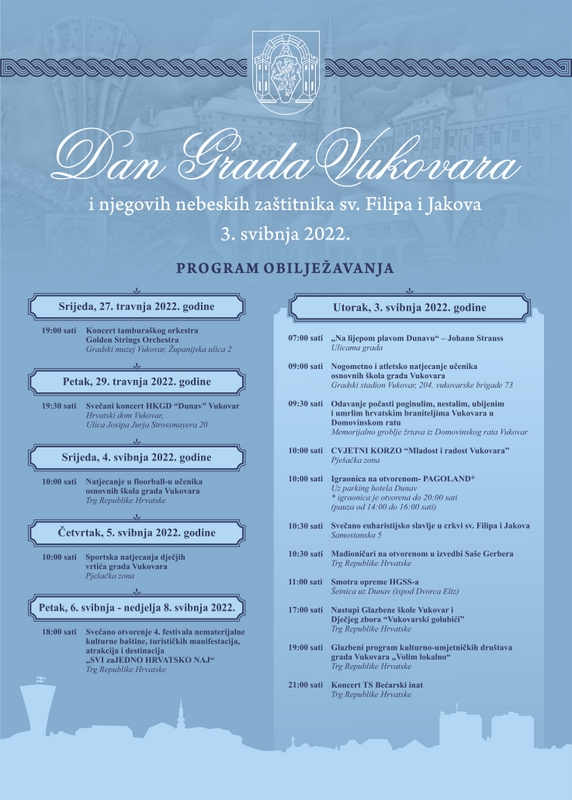 Sam 03. svibanj, kako to već tradicija nalaže, započeti će simbolično izvedbom Johanna Straussa „Na lijepom plavom Dunavu“ koja će mobilnim razglasom u ranim jutarnjim satima proći ulicama Vukovara. Uslijediti će odavanje počasti na Memorijalnom groblju žrtava iz Domovinskog rata svim hrvatskim braniteljima Vukovara te će biti služena sveta misa u crkvi sv. Filipa i Jakova koju će predvoditi vlč. Zvonimir Martinović, župnik Župe BDM Kraljice Mučenika.